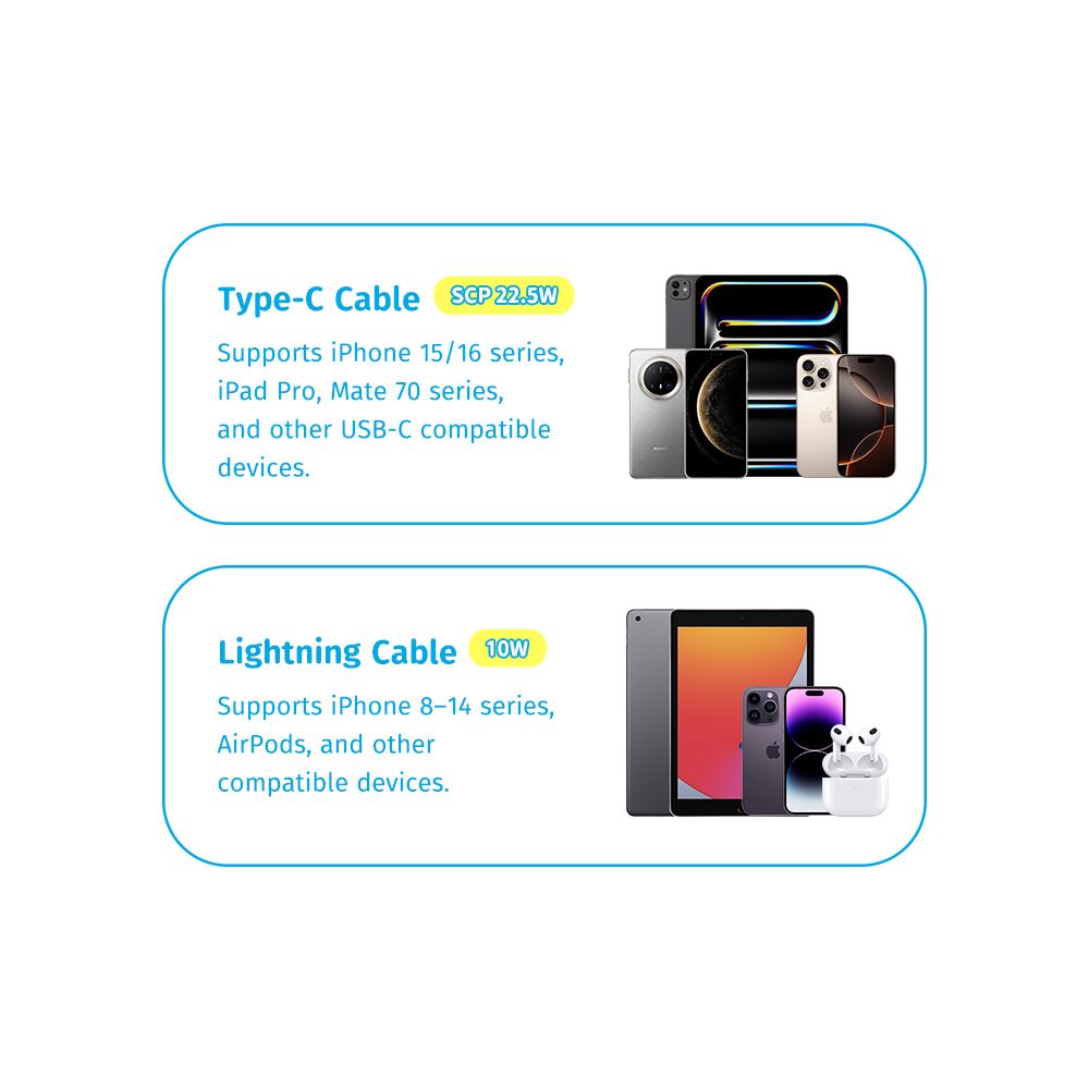 USB-A / Type-C Cable Output: 5V-3A, 9V-2.22A, 12V-1.5A, 10V-2.25A(22.5W)